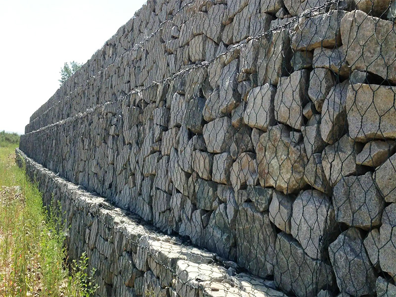 石籠擋墻是由工廠按照設(shè)計(jì)尺寸規(guī)格加工成雙扭結(jié)六角形的網(wǎng)目后,現(xiàn)場(chǎng)拼裝成箱式網(wǎng)籠或墊式網(wǎng)籠,網(wǎng)籠施工主要是立架、裝料、砌平及封口等。